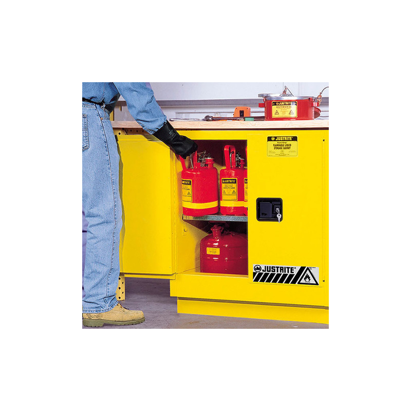Product Overview: The Justrite Sure-Grip® Undercounter Safety Cabinet (model 892300) offers safe, convenient storage of flammable liquids near work areas. Designed to fit beneath countertops and workbenches, it enhances ergonomic efficiency with a recessed toe kick.