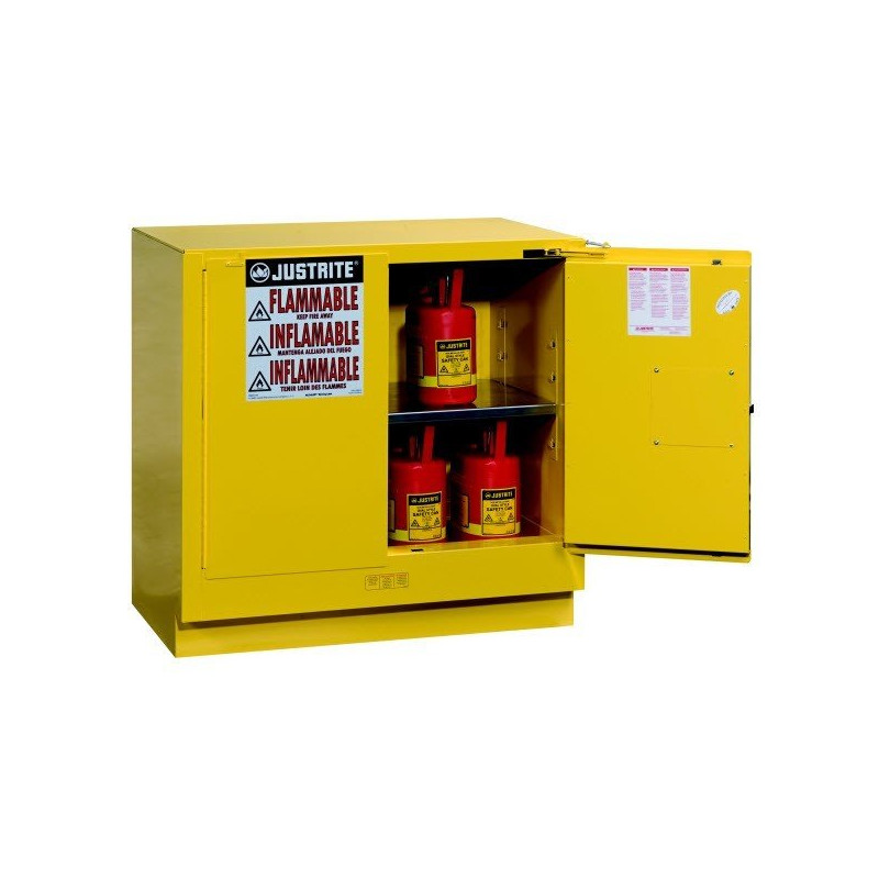 Compliance and Warranty: Justrite cabinets comply with OSHA, NFPA 30, and NFPA 1 requirements, carry a 10-year warranty, and are tested and approved by FM Approvals.