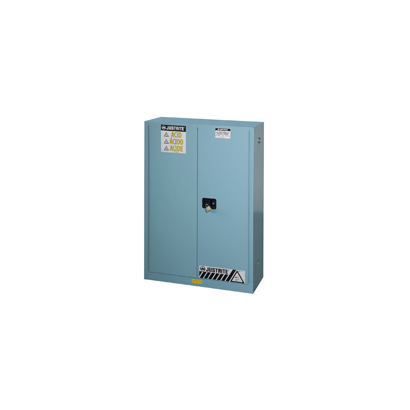 Justrite Blue Steel Safety Cabinets for corrosives have the same quality safety features as the cabinets for flammables. All models come with double-wall construction, dual vents, grounding wire connections, adjustable shelves, leakproof sills, three point self-latching doors and leveling feet. Self close doors shuts and latches automatically when a fusible link melts at 165F under fire conditions. Unique, concealed self-closing mechanism offers obstruction-free access to contents.