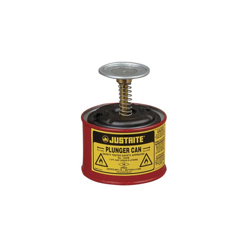 A 0.5 Litre Justrite Steel Plunger Can manufactured by Justrite and supplied in the UK by Fire Safety Compliance. Ref no. 10008 These are ideal for dispensing flammable liquids and allow the user to moisten cleaning cloths and rags. The dasher plate acts as a flame arrestor and the smart pump system is designed to dispense a suitable volume whilstdraining the container down to a few mililitres to reduce the frequency of refilling.